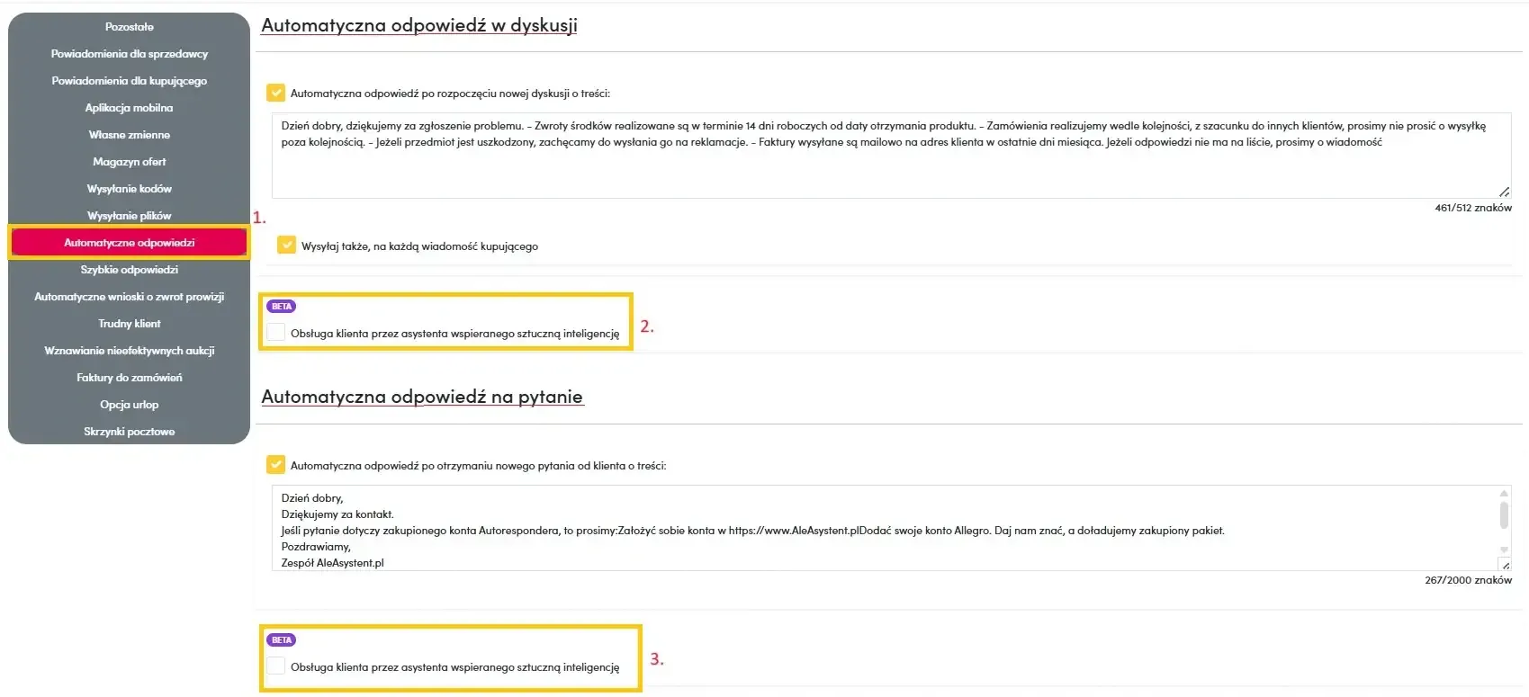 Then, after selecting the Automatic responses (1) tab, there are two options for customer service by AI (2 and 3). The first is in the category Automatic response in discussions, and the second in Automatic response to questions. This way, you can decide whether artificial intelligence should respond in both cases or only to questions.