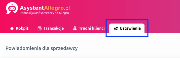 To enable notifications about discussions with buyers on Allegro, log in to your account on AleAsystent.pl and go to the Settings section.