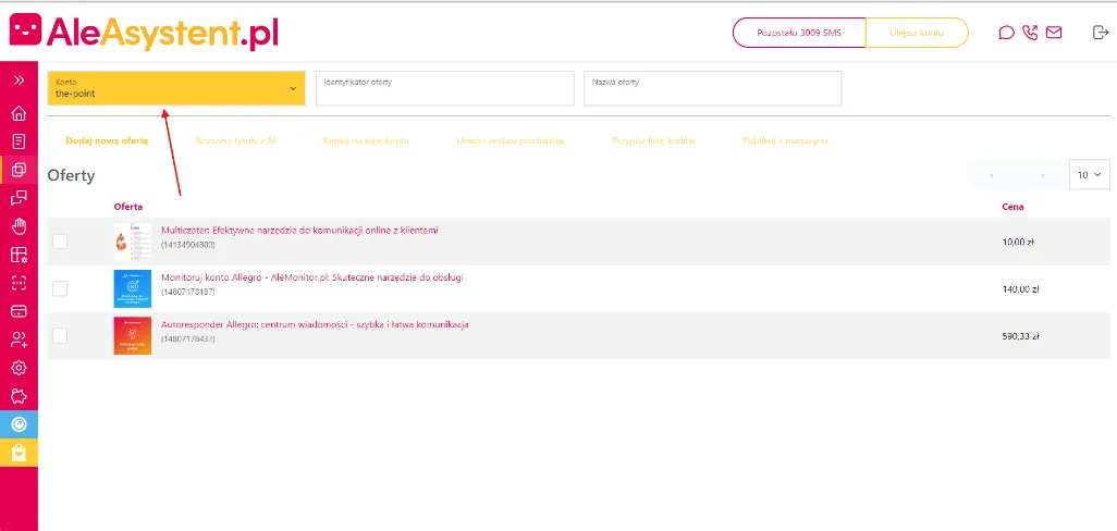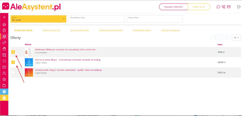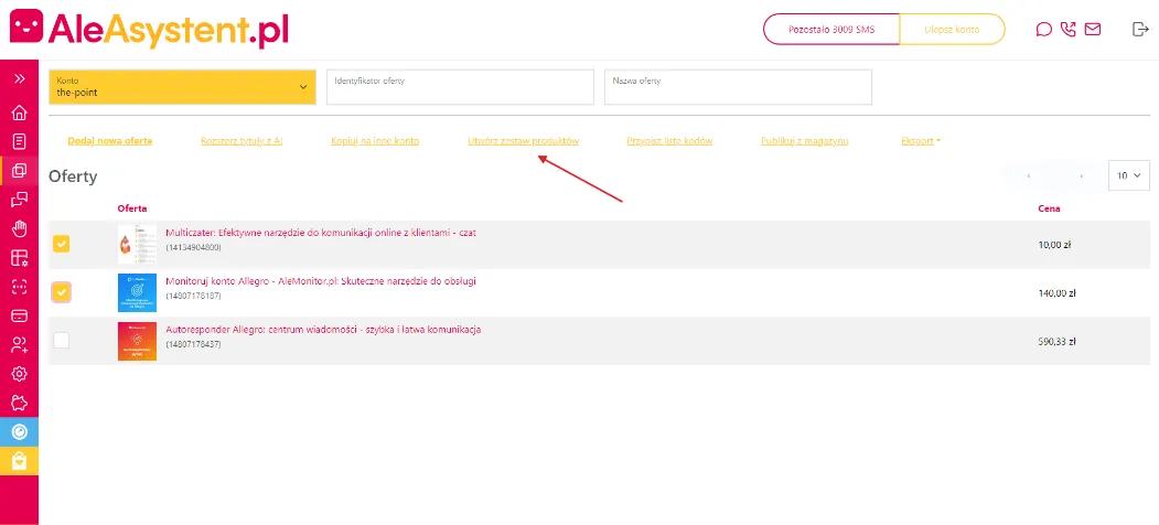 The AleAsystent tool allows for bulk creation of Allegro sets from existing offers. All you have to do is check the products you want to combine in the Offers tab and use the Create product set function. The system automatically generates a new package offer, saving you time on manual data copying.