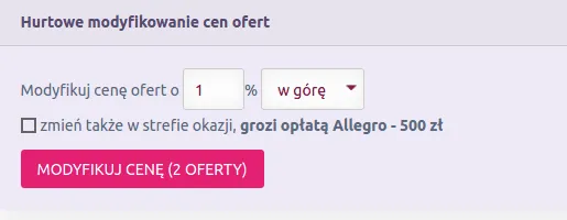 AleAsystent has an option that significantly simplifies this. The system can bulk raise or lower the prices of all or selected items from a list by a desired percentage value. It's also possible to modify prices in auctions from the Deals Zone, however, we recommend contacting Allegro beforehand. The auction service may impose a fee for violating the Deals Zone regulations, which amounts to 500 PLN.